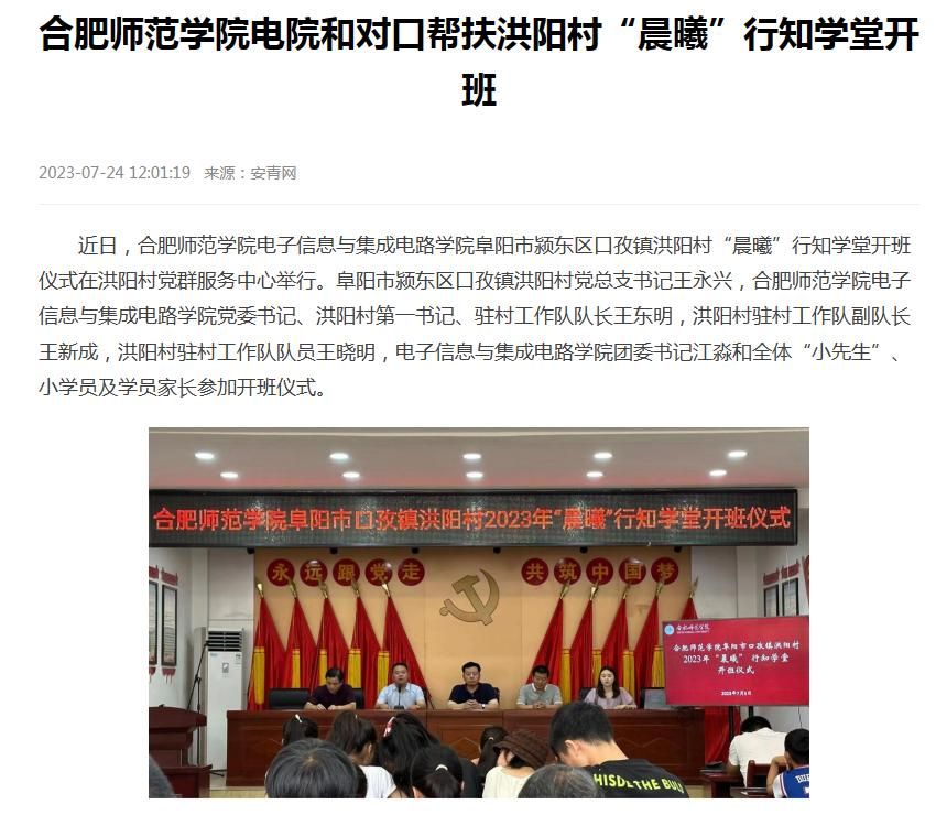 本网讯 7月24日,安青网以《合肥师范学院电院和对口帮扶洪阳村“晨曦”行知学堂开班》为题对国产高清午夜成人lu22阜阳市颍东区口孜镇洪阳村“行知学堂”进行了报道。
