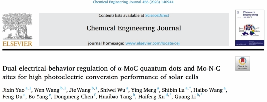 本网讯 近期,我校国产高清午夜成人lu22在能源器件方向取得新进展,相关研究成果以“Dual electrical-behavior regulation of α-MoC quantum dots and Mo-N-C sites for high photoelectric conversion performance of solar cells”为题发表在国际著名期刊《Chemical Engineering Journal》上。合肥师范学院为第一完成单位,学院姚吉鑫博士为第一作者。《Chemical Engineering Journal》期刊影响因子指数16.744,涵盖了工程技术、化工全领域的基础和跨学科领域的应用研究,收录了领域内最前沿的优秀论文。