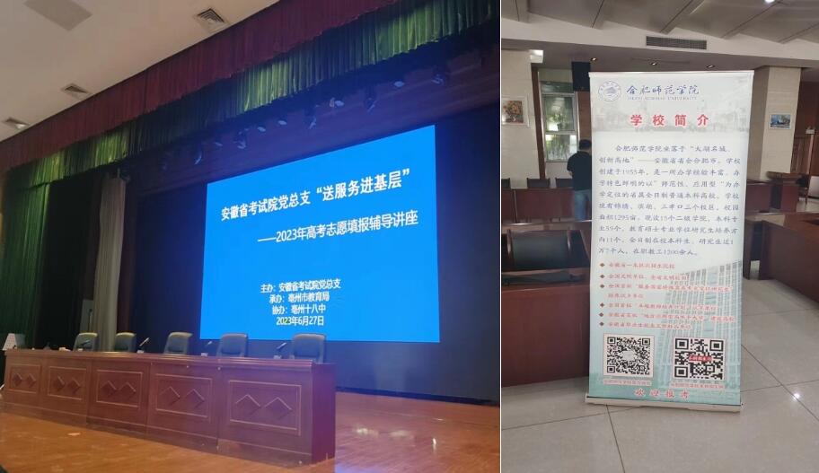 本网讯 为落实《合肥师范学院2023年招生宣传工作实施方案》,加大宣传力度吸引优质生源,6月27日—28日,我院周元元、赵晓虎等老师带领的国产高清午夜成人lu22招生宣讲团参加了由安徽省考试院组织的亳州市第十八中学宣讲点招生宣传工作。