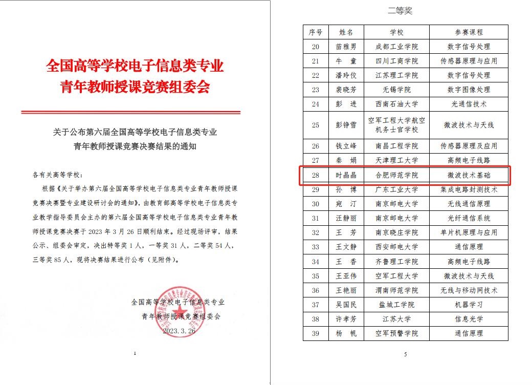 本网讯 3月26日,由教育部高等学校电子信息类专业教学指导委员会主办的第六届全国高等学校电子信息类专业青年教师授课竞赛决赛顺利结束。经过现场评审、结果公示、组委会审定,我校国产高清午夜成人lu22时晶晶老师获评全国二等奖,讲授的课程是《微波技术基础》。