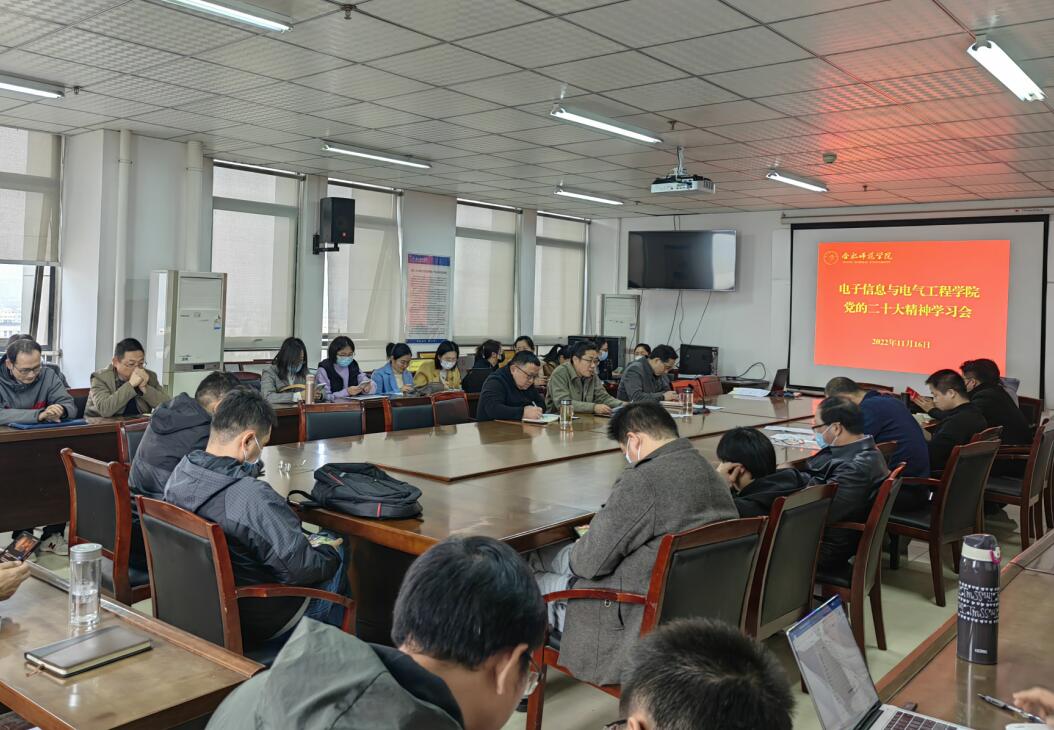 本网讯 11月16日下午,电子信息与电气工程学院党委在锦绣校区行知楼1210会议室开展党的二十大精神学习会,院长张忠祥、党委副书记胡石清、副院长范程华和全体教职工参加学习活动。会议由张忠祥主持。