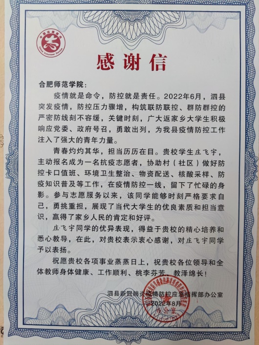 本网讯 近日,我校电子信息与电气工程学院收到来自安徽省宿州市泗县新冠肺炎疫情防控应急指挥办公室发来的感谢信。信中对我院2020级通信工程班庄飞宇同学在暑假期间积极主动加入泗县疫情防控志愿服务队伍,为当地疫情防控工作贡献青春力量提出表扬,并对我校立德树人、人才培养建设给予高度肯定和赞扬。