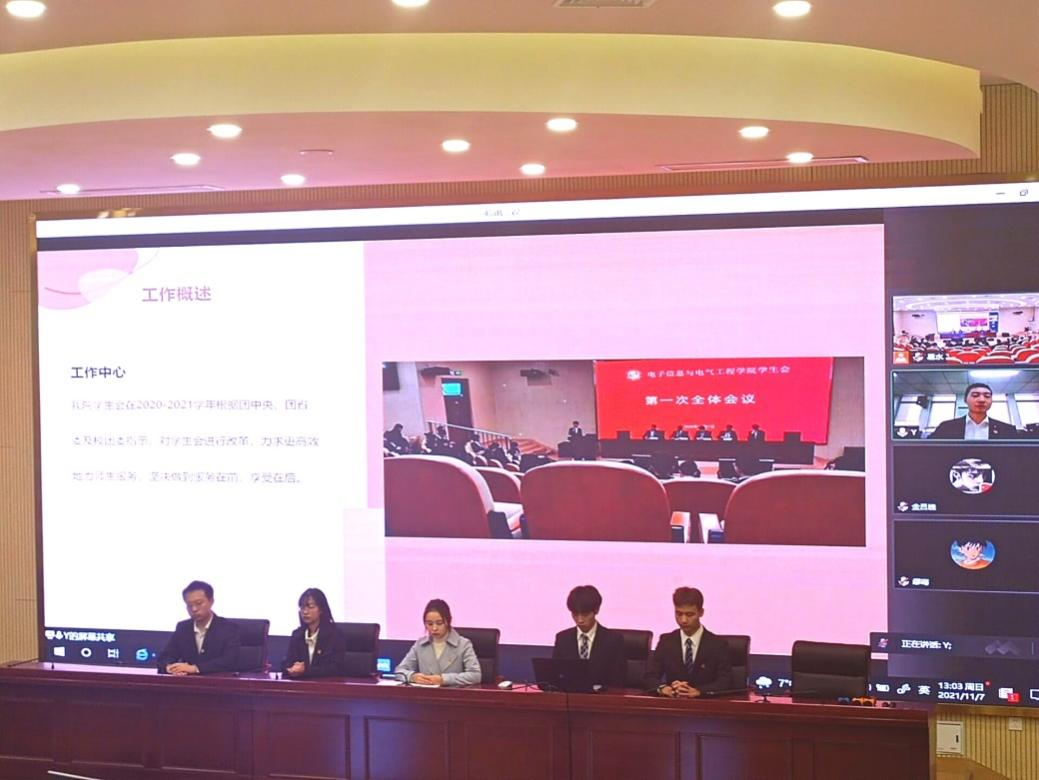 本网讯 11月7日下午,电子信息与电气工程学院第一次学生代表大会顺利举行。为配合疫情常态化防控要求,本次大会采取了两校区同步、实时网络直播方式,主会场设在滨湖校区学术报告厅,分会场设在锦绣校区行知楼1210会议室。辅导员周玉老师、分团委书记江淼老师以及学院36名学生代表参加大会。大会全面总结了过去一年电院学生会各项工作,选举产生了电院学生会新一届主席团成员。