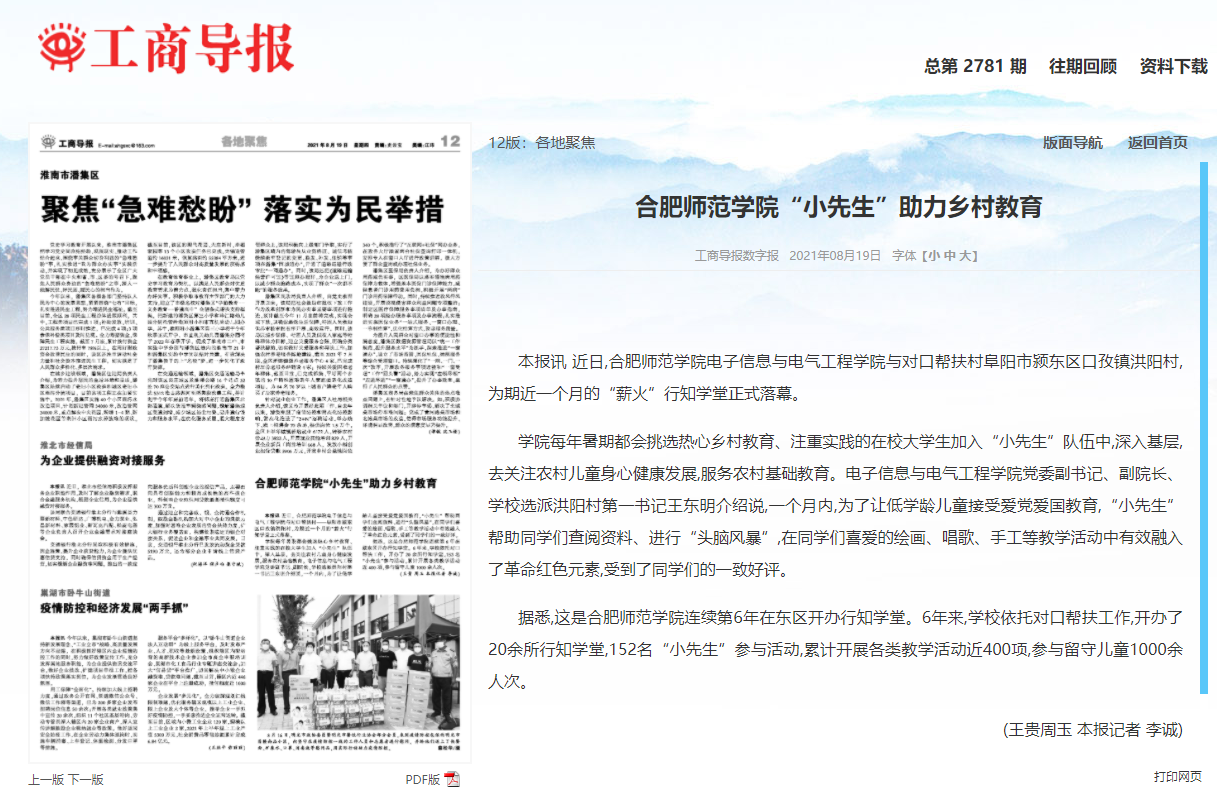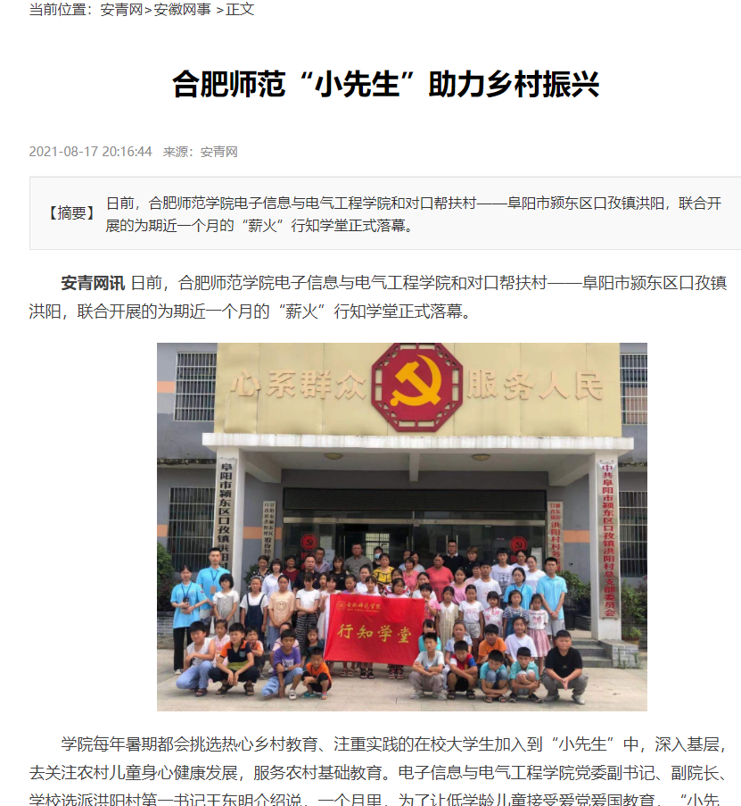 本网讯 7月15日-8月上旬,我院电子信息与电气工程学院在阜阳市颍东区孜口镇洪阳村开展了为期一个月的“行知学堂”暑期社会实践活动。8月17日,安青网以“合肥师范小先生助力乡村振兴”为题进行了报道。8月19日,安徽工商导报以“合肥师范小先生助力乡村教育”为题进行报道。(电院:周玉)