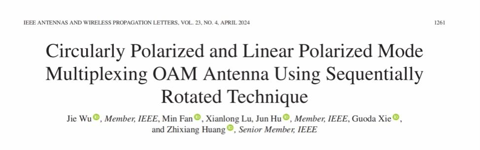 近期,相关成果以“Circularly Polarized and Linear Polarized Mode Multiplexing OAM Antenna Using Sequentially Rotated Technique”为题被期刊IEEE Antennas and Wireless Propagation Letters发表(论文引用格式:Jie Wu, Min Fan, Xianlong Lu, Jun Hu, Guoda Xie and Zhixiang Huang, Circularly Polarized and Linear Polarized Mode Multiplexing OAM Antenna Using Sequentially Rotated Technique[J], IEEE Antennas and Wireless Propagation Letters, 2024, vol. 23, no. 4, pp. 1261-1265. )。该期刊为中国科学院二区TOP期刊,影响因子为3.7。合肥师范学院为该论文的第一单位,电子信息系统仿真设计安徽省重点实验室、国产高清午夜成人lu22吴杰老师为第一作者。