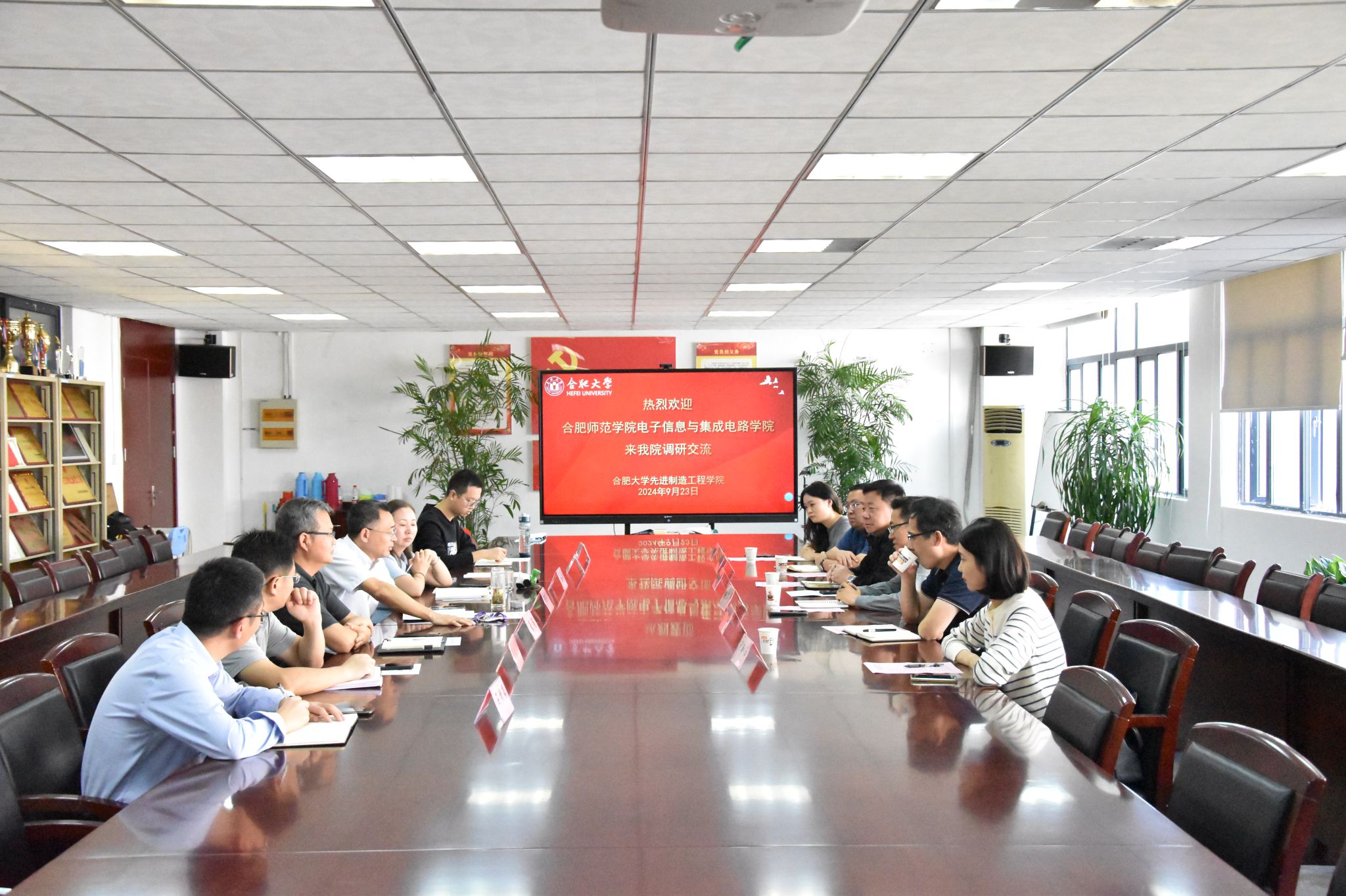 本网讯 为进一步学习贯彻党的二十届三中全会精神,认真学习全国教育大会精神,根据学校高质量发展大调研大讨论大行动的工作部署,9月23日上午,国产高清午夜成人lu22党委书记王东明、院长张忠祥带队赴合肥大学先进制造工程学院调研学习,党委副书记胡石清、副院长范程华等参加。合肥大学先进制造工程学院党委书记杜娟、院长胡学友、副院长秦强、胡国华等热情接待了我院一行,双方共同召开高质量发展交流座谈会,会议由胡学友主持。
