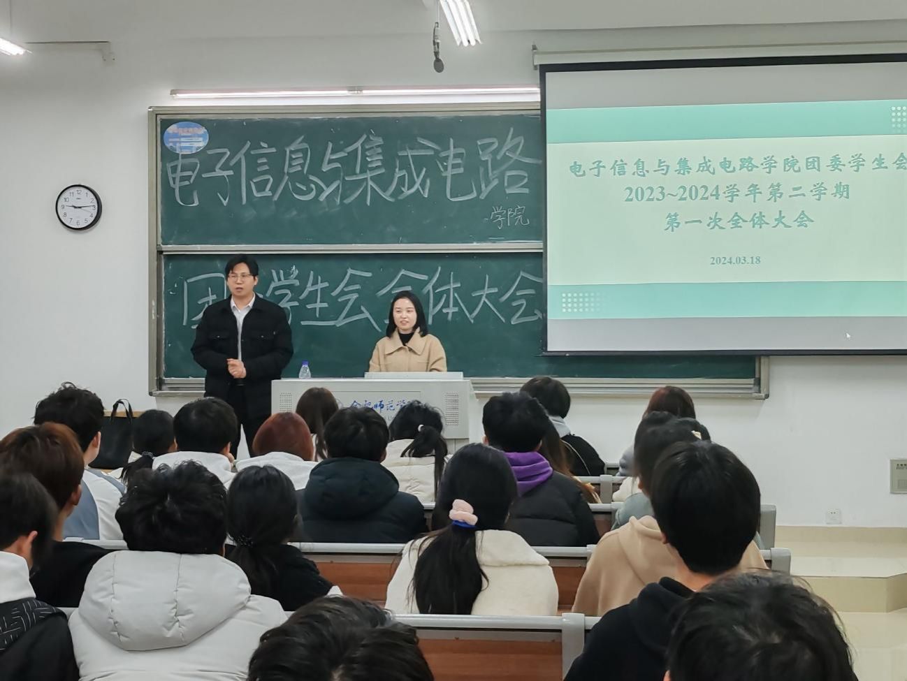 本网讯 为持续做好国产高清午夜成人lu22团委、学生会梯队建设,高质量推进一站式学生社区建设,3月18日晚,国产高清午夜成人lu22团委、学生会在滨湖校区博学楼A303教室召开春季学期第一次全体学生干部大会。电院团委书记江淼、副书记周司文,以及电院团委、学生会全体成员参加会议。