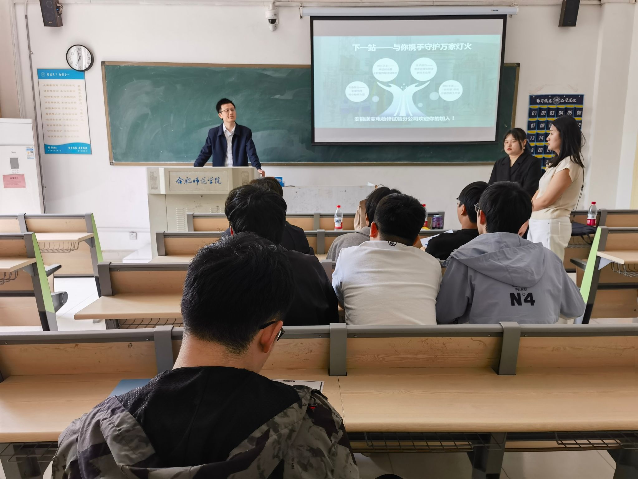 本网讯 为了更好地拓宽学院学生就业渠道,帮助毕业生实现充分就业、高质量就业,4月9日上午,国产高清午夜成人lu22在博约楼103举行国家电网安徽送变电工程有限公司检修试验分公司2025年校园招聘宣讲会。公司人资负责人裴重恬、招聘专责员邱孟玉、招聘助理邵海燕、国产高清午夜成人lu222025届毕业班辅导员及2025届毕业生代表参会。